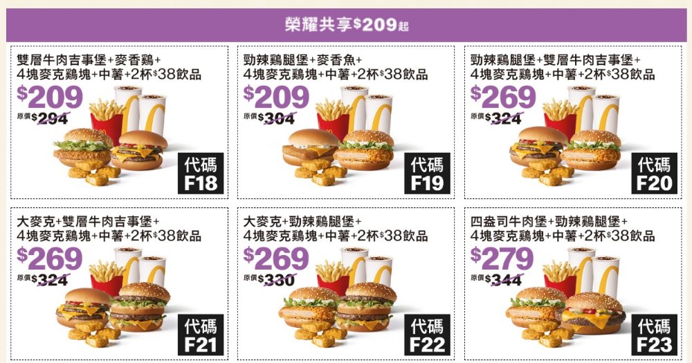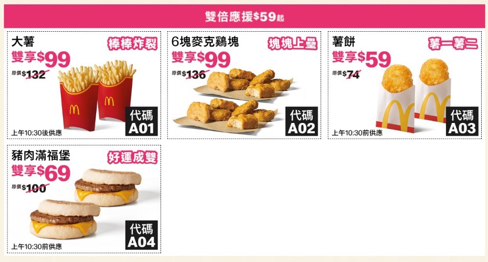 這區主打「加一點點錢就多一份」的雙倍應援系列,最低只要 $59 就能享受雙倍美味,喜歡薯條、雞塊的朋友,這一區絕對是你的首選!雙享優惠超划算,不管是早餐想多吃一個滿福堡,還是下午茶想跟同事分享雞塊,用這些代碼點餐,直接幫你省下好幾枚銅板