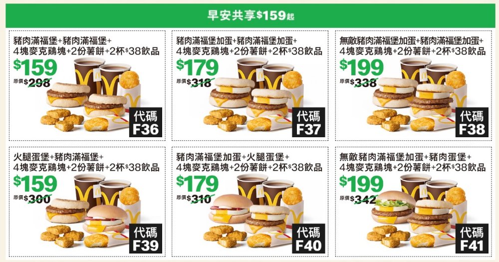 早餐想要澎派吃點這區就對了!每項優惠都包含:2份早餐主餐 + 4塊麥克雞塊 + 2份薯餅 + 2杯38元飲品,從經典滿福系列到無敵大份量通通有,最高現省超過140元