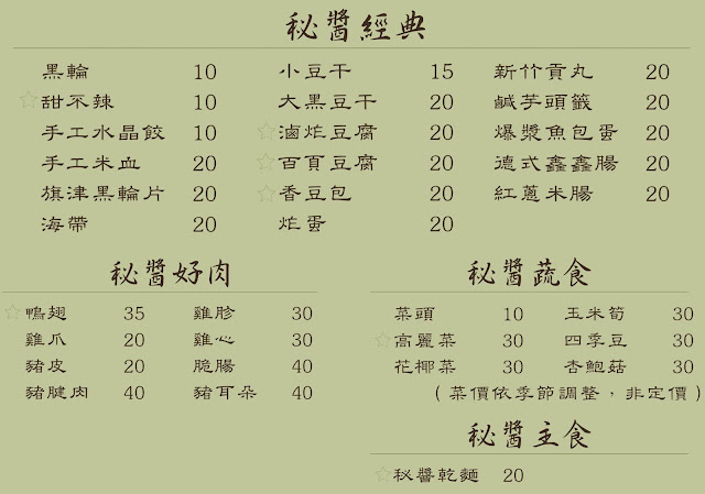 這邊提供秘醬滷味的菜單給你們參考,基本上一般冷滷攤位能夠看到品項的種類,這裡通通都能吃得到,而且價位也相當平價,即使是學生或小資族也都能買個一大包回家慢慢嗑~不過每間分店販售的品項,會依當地朋友的喜好而有所不同哦!