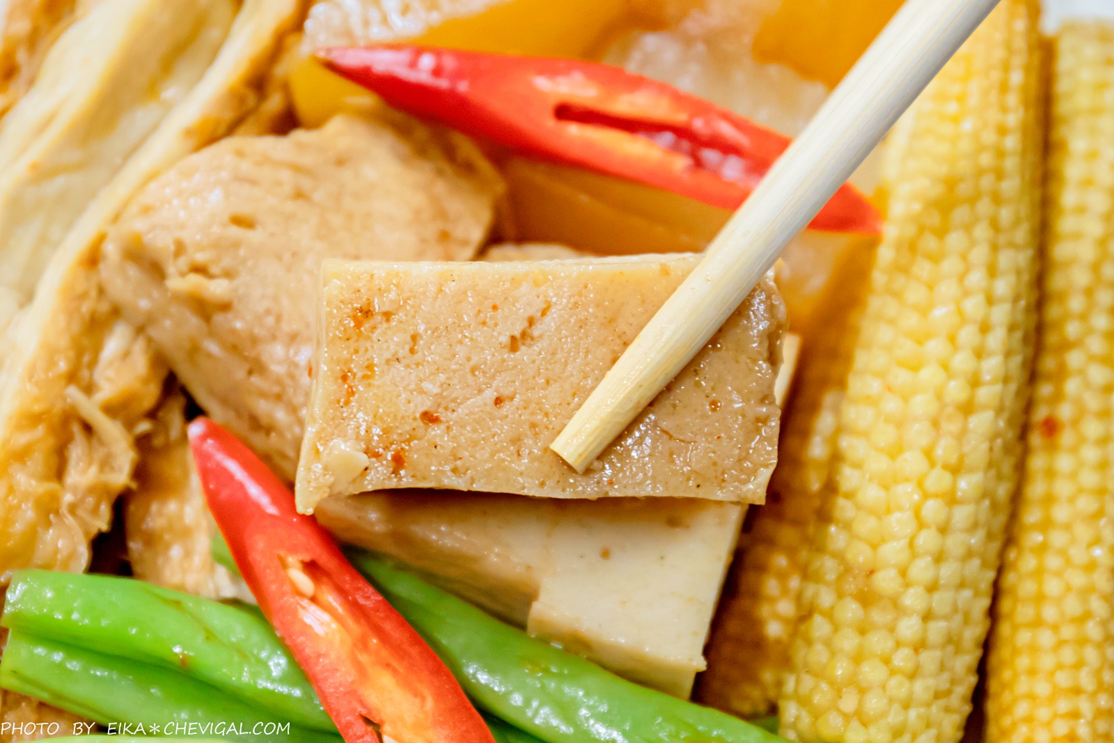 我們先點了份最基本款的品項:豆干、花椰菜、杏鮑菇、土豆、甜不辣、米血與滷炸蛋,味道都很入味。