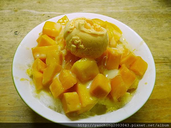 招牌芒果冰-許多人夏天都是為了這碗而來,幾乎用掉一顆小金煌的芒果冰相當有誠意,上頭還有一球芒果冰淇淋,芒果醬也是現打的醬汁,酸酸甜甜味道還不差,淋上煉乳後個人覺得比XXX頭冰的還要好吃,CP值也更高,但芒果本身屬於比較燥熱的水果,食用仍要視自己狀況來斟酌。
