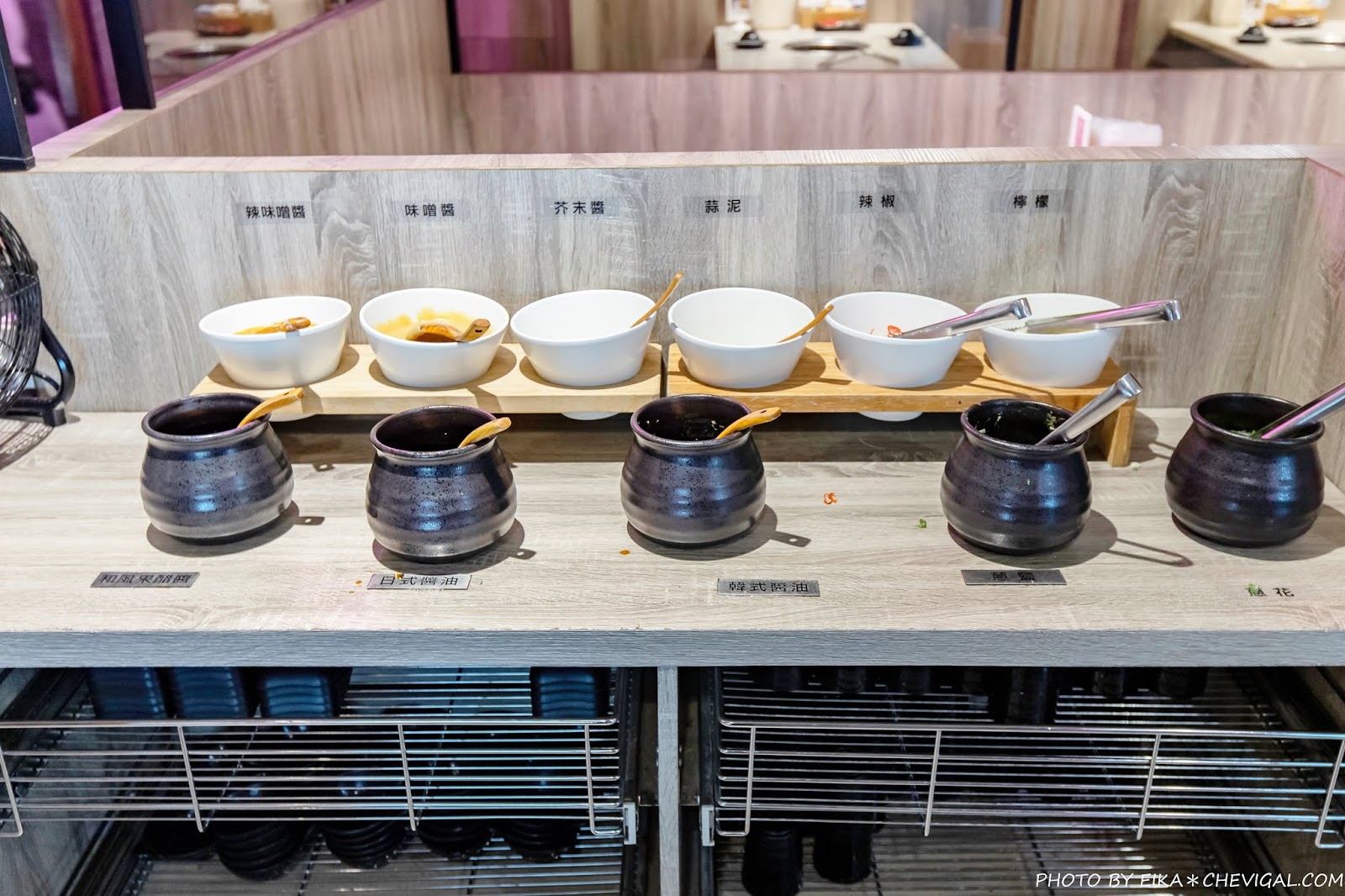 以我們目前吃過的台中燒肉吃到飽來說,這裡的醬料可以說是提供得最多、最齊全的;從辣味噌醬、味噌醬、芥末醬、蒜泥、辣椒到檸檬切片,甚至連和風果醋醬、日式醬油、韓式醬油、蔥鹽與蔥花都一應俱全。