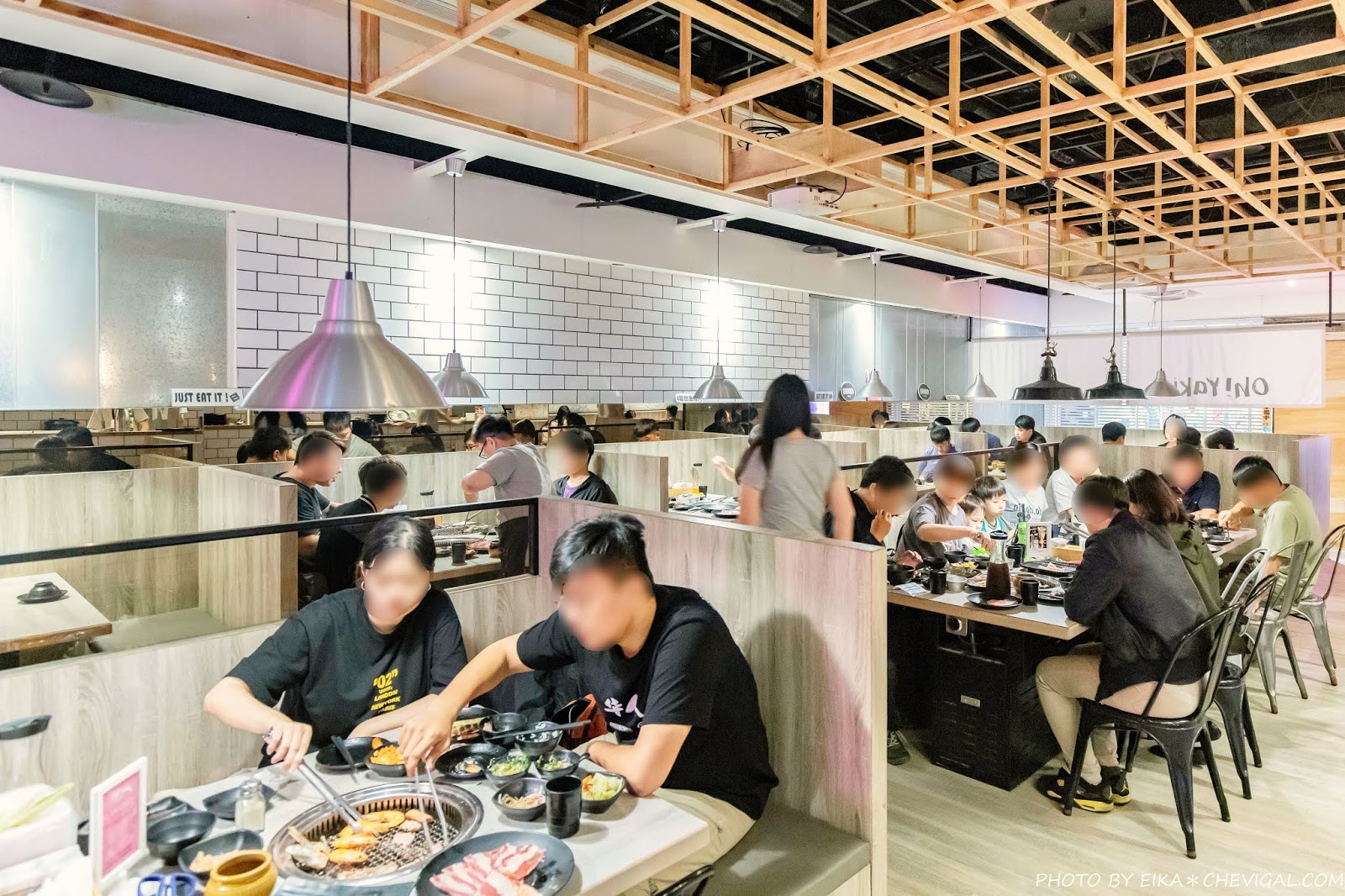 店內偏向現代工業風的設計,各桌之間不僅多有隔板區隔開來,桌距也相當寬敞,還蠻適合與家人、朋友一起來聚餐;不過用餐時段的人潮真的很多,非常容易客滿,建議你們可以事先訂位。