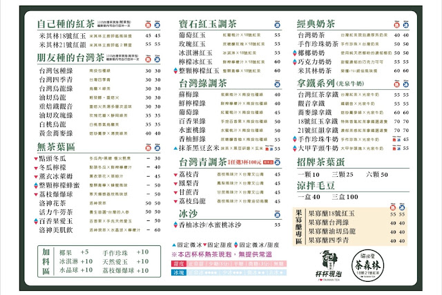 這裡提供貓頭鷹茶森林的菜單給你們參考,目前有供應將近五十款飲品,拿鐵系列的品項是選用光泉牛奶製作,而且還有多種配料可以加購!最酷的是竟然還有販售茶葉蛋與涼拌毛豆~