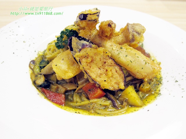 親食砌蔬食Cafe是蔬漫小姐的姐妹店,有著一顆炙熱的心料理出獨特美味蔬食,想讓每個人有一種難忘的用餐體驗,餐廳內所有餐點均不含植物五辛(蔥、蒜、洋蔥等),素食者來店可盡情享用美食不怕吃到葷食,金匠義大利麵,由不同咖哩醬及香料調製的醬料,香薰的層次分明,上方還有著炸蔬菜,這盤真的是料多實在、濃郁好吃!