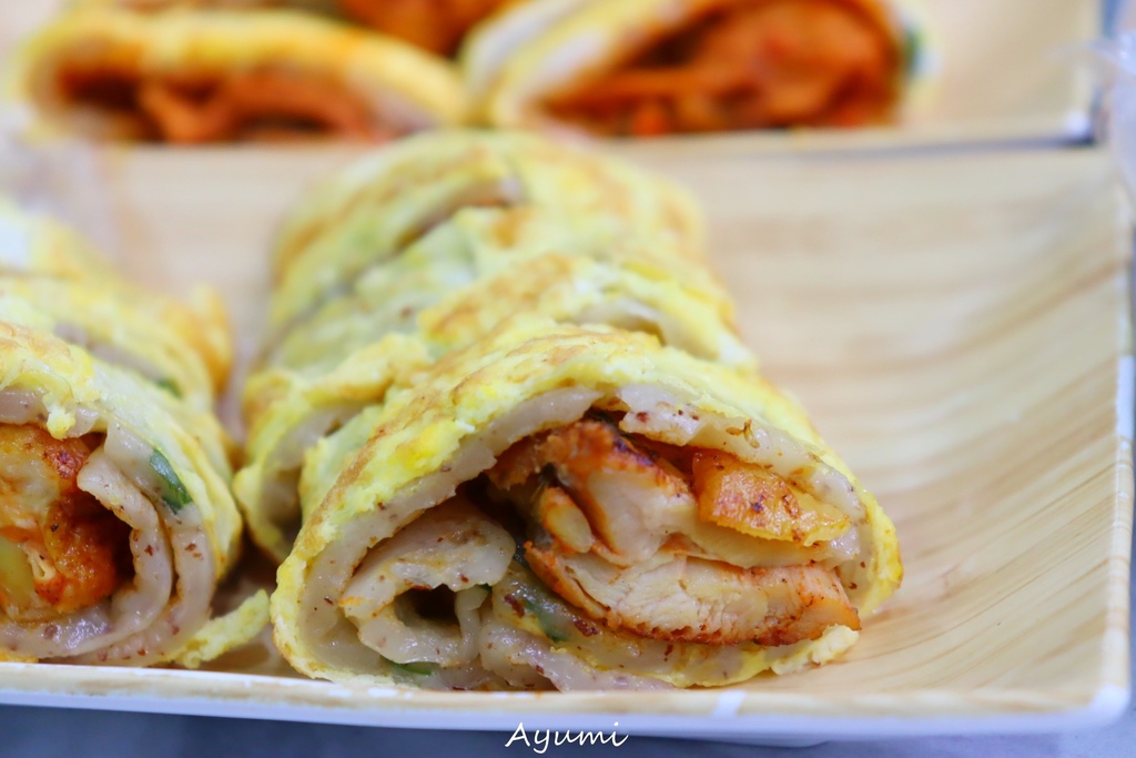 粉漿蛋餅-韓式泡菜燒肉/招牌嫩煎雞腿-粉漿蛋餅跟一般早餐店的蛋餅,我覺得吃起來的口感真的挺有差異性的,當然都有一定的支持者喜愛,日十的粉漿蛋餅還特地混合了兩種不同的小麥胚芽,不僅僅營養值提升了不少之外,還多了麥香留在後韻,比較喜歡粉漿蛋餅是因為他吃起來口感偏Q,這次點了韓式泡菜燒肉跟嫩煎雞腿,餐點都是現點現做,所以必須要稍等待餐點,但我覺得這美味是值得等待的,韓式泡菜真的還滿道地的,吃起來微辣帶點酸感,搭配燒肉跟粉漿蛋餅一口吃真的超爆搭的,微酸辣泡菜真的很開胃解膩~~另外的嫩煎雞腿吃起來鮮嫩,感覺光這一份女孩子吃完就會很有飽足感!