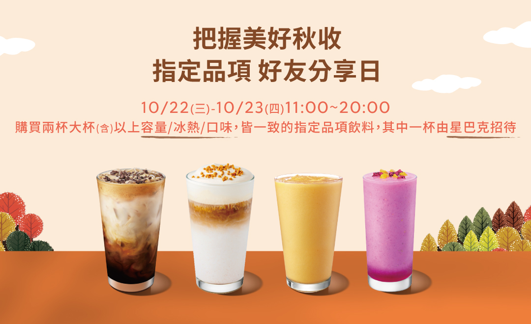 10/22-10/23星巴克限時兩天買一送一!星巴克於10/22推出「把握美好秋收 指定品項 好友分享活動」優惠活動,活動當日11:00-20:00至門市購買指定兩杯大杯/風味/冰熱一致的指定品項飲料,其中一杯星巴克招待