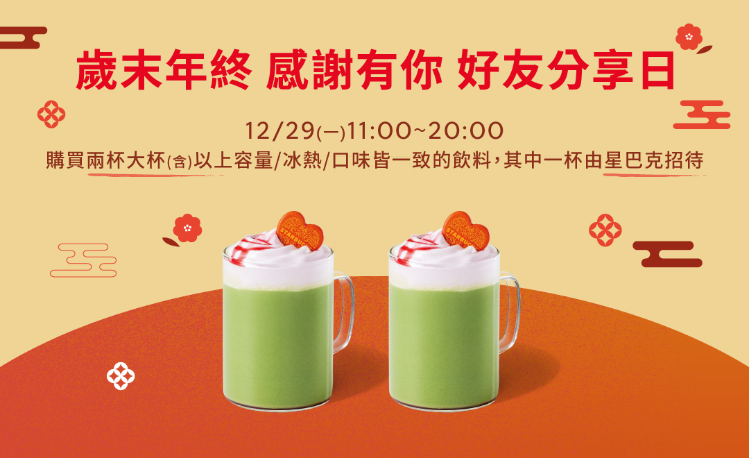 星巴克限時一天買一送一!星巴克於12/29推出「歲末年終 感謝有你 好友分享日」優惠活動,12/29活動當日11:00-20:00至門市購買指定兩杯大杯/風味/冰熱一致的品項飲料,其中一杯星巴克招待