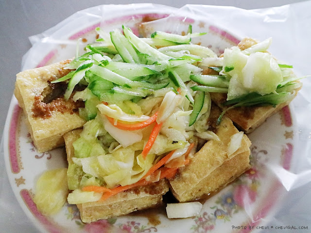 一份臭豆腐45元,整盤共有五大塊臭豆腐、黃瓜絲與泡菜,他們家的臭豆腐口感偏濕一些,所以吃來不會刮舌或刮喉,但是還是能夠吃到外表的香酥;內餡則是非常軟嫩,甚至還會有著快要爆汁的感覺,是魚兒蠻喜歡的口感!