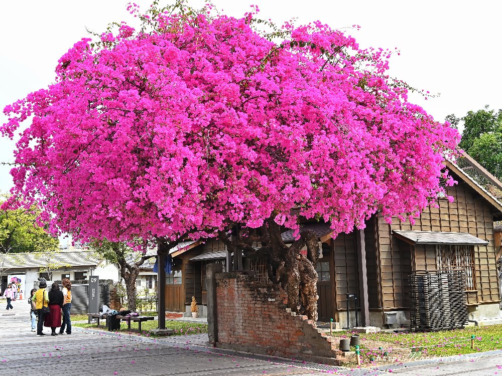 一走進園區,很難不被它壯觀的身影吸引。這株九重葛就佇立在日式木造建築與綠意草坪之間,鮮豔的桃紅色花苞與充滿歷史感的日式官舍建築交相輝映,構成了一幅唯美的日系風景畫