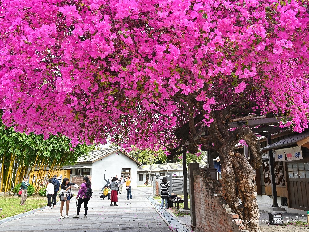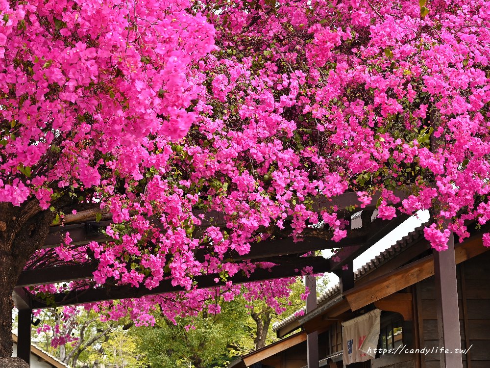 每逢3月盛開期,整棵樹會被密密麻麻的桃紅花苞覆蓋,像是一把巨大的粉紅花傘,也像是從屋簷傾瀉而下的花海瀑布。這株九重葛最特別的地方在於它與建築物的融合感,當陽光穿過繁花灑在木質牆板上,光影交織出的畫面真的非常迷人,難怪會成為攝影愛好者與網美們爭相朝聖的必拍點!