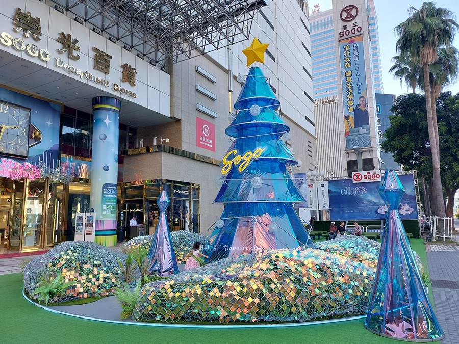 台中廣三SOGO百貨2025聖誕樹也在11月就佈置完成,以「極光聖誕樹」為主題,白天是藍色的,晚上還會有精彩的夢幻光影燈光秀喔!廣三SOGO聖誕樹高約7米,一旁還有兩座2米高小樹,周邊鋪設了萬片幻彩菱片。夜間會有七彩燈串、幻彩軟片與動感聖誕音樂營造沉浸式冬日氛圍。夜間聖誕燈光秀即日起到明年(2026)1/4止,晚上六點到十點,每15分鐘一場,平假日都能看得到喔!