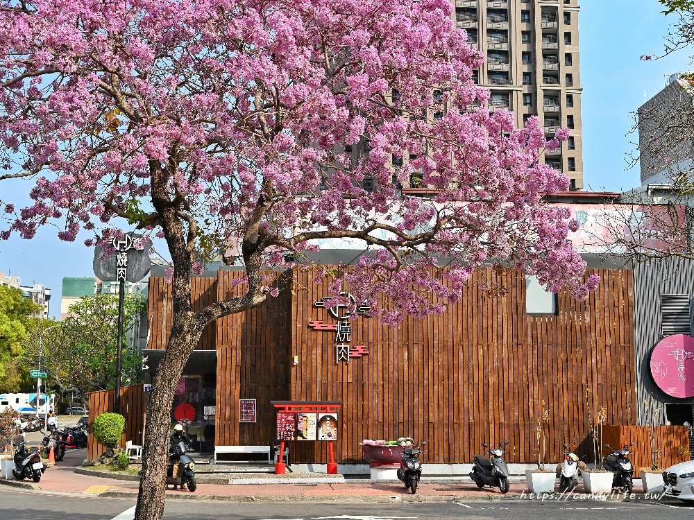 除了美術館正前方的開闊大道,繞進周邊的小巷弄更是驚喜連連。糖糖特別喜歡那一處緊鄰著日式燒肉店的轉角,溫暖的木質調建築外牆,在盛開的粉紅風鈴木映襯下,散發出一種京都街頭的既視感。這裡的花球開得極其茂密,與街道上的機車、紅綠燈構成了一幅台式與日式混搭的獨特日常