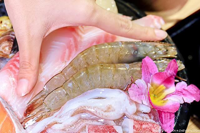 厚切鮭魚片具有粉橘色的美麗色澤,厚實的肉質不失鮮嫩細緻,透抽吃起來更是Q彈不韌口。
