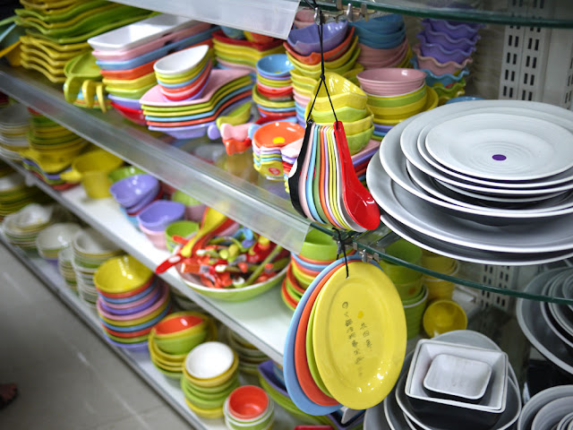五顏六色不同造型的盤子與杯子,繽紛的色彩讓人目不轉睛。
