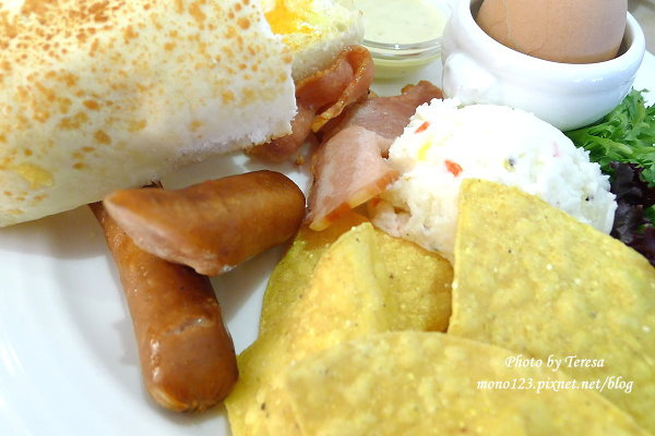 這樣一盤早午餐,有蔬菜、水果、吐司、麵包、馬鈴薯泥、炒蛋、培根和德式香腸,什麼都有,果然是吃很飽啊!端上桌就看到超大的德式香腸,配上黃芥末醬真的是無敵搭。味道都屬於比較重口味的,我就很喜歡一口香腸一口麵包、一口培根一口吐司這樣吃。
