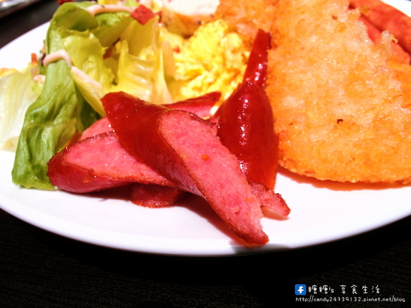 沙拉採用新鮮生菜,搭配玉米粒及果乾,淋上店家特調的番茄美乃滋,微酸微甜好清爽,德式香腸口感Q彈帶點脆度,吃起來稍微偏鹹了些,可以搭配一旁的沙拉一起吃。