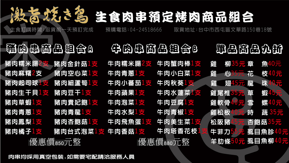 熱血採訪│狂賀全台唯一激旨燒鳥串燒專利通過,中秋節烤肉禮盒海陸豪華超值套餐回饋台中鄉親!現在你不用再跟著別人大排長龍,只要一通電話提前預購,將可以用低於市價85折的優惠,優先搶購激旨燒鳥的海陸豪華超值套餐!(其他可參考逢甲夜市美食)