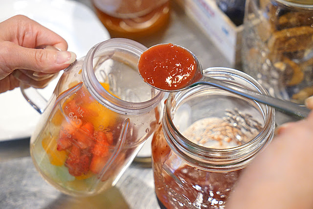 拿去果汁機攪拌攪拌一下,瞧瞧!超級滿的水果。