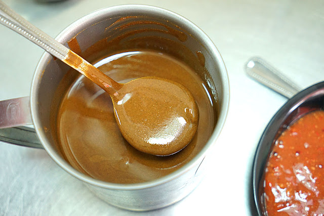 招牌小菜,有菜頭粿加米腸加蛋,你以為只有這樣嗎?實際上應該算是四吃了吧?裡面其實是芋頭糕再上層,蘿蔔糕在下層,現點現煎,左邊的醬帶點甜味,有種南部上來的感覺,若要吃比較辣些的,則可以去加桌上的辣醬,想吃甜吃鹹吃辣通通都可以。