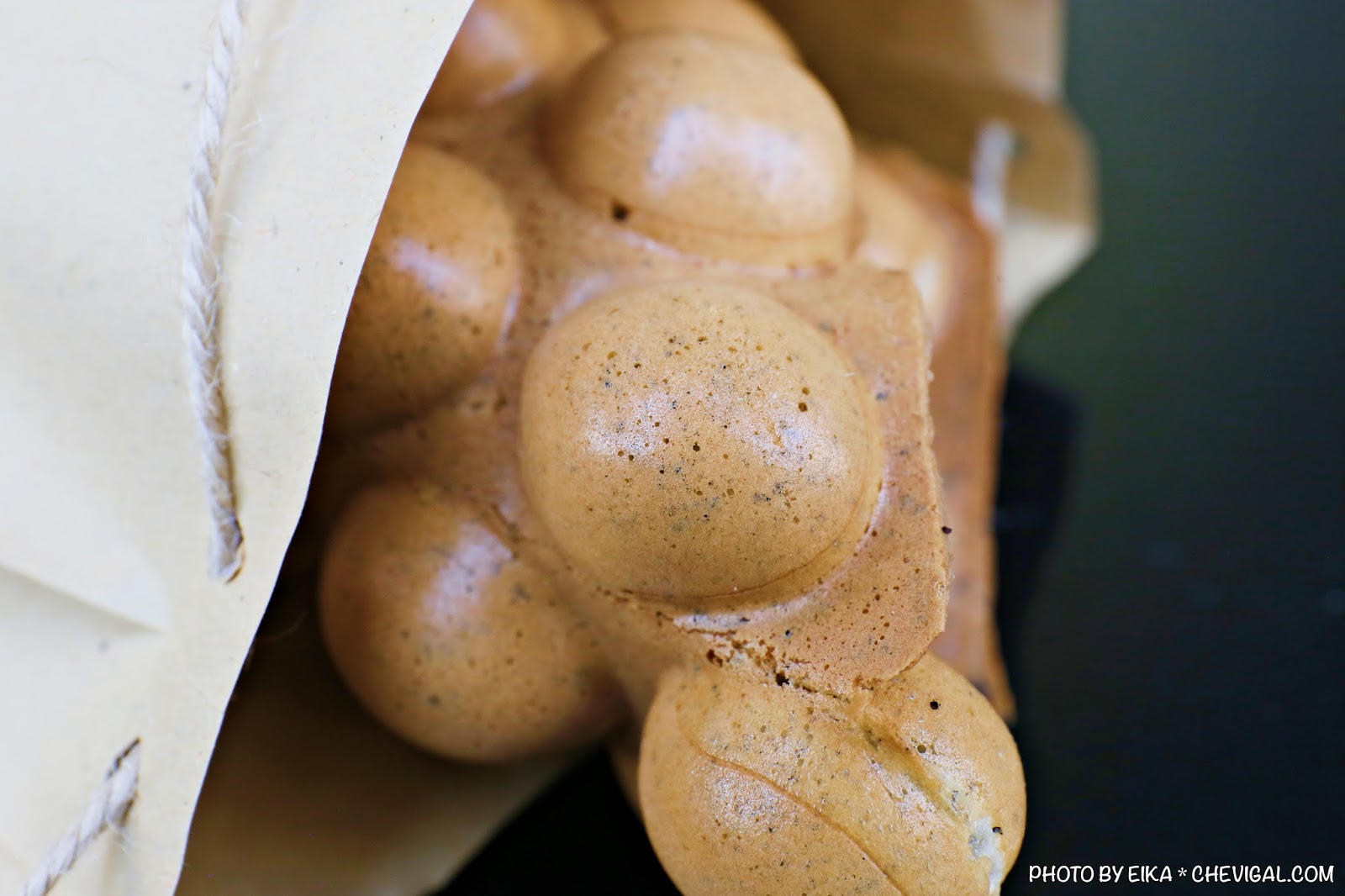 不過後來我們還是點了網友推荐的伯爵紅茶口味,剛烤好的雞蛋仔外表酥脆,輕輕一剝就很容易剝下來,還能稍微看到茶葉的顆粒耶!
