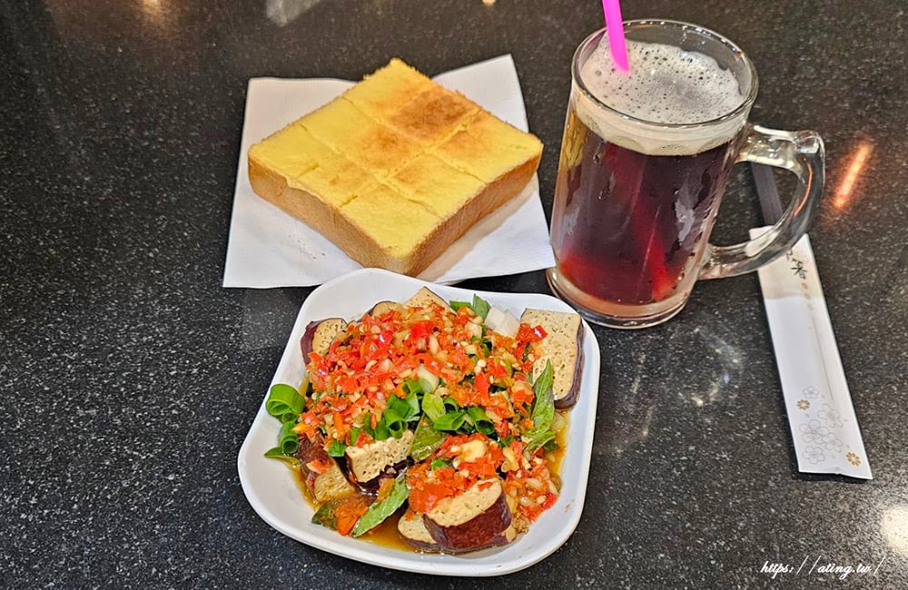 點紅茶微糖$60(小杯)、烏龍豆干(辣)$70、厚片吐司-奶酥$70