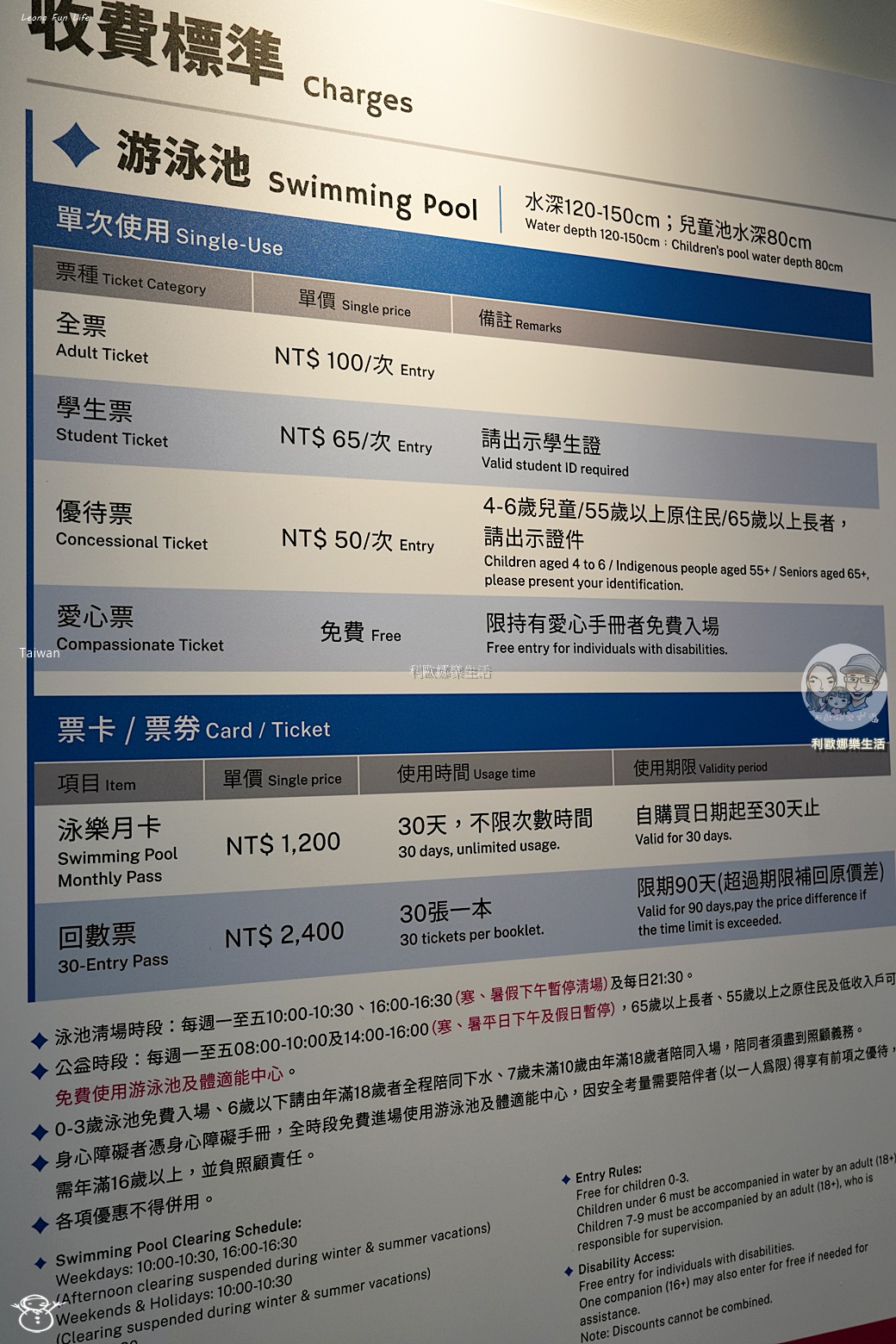 泳池入場費用為全票$100、學生票$65(須出示學生證)、優待票$50、愛心票免費入場。