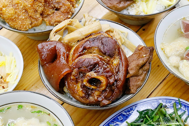 就是這碗超大碗的豬腳飯!一開始送上桌時,其實是分成白飯與豬腳兩碗,小心翼翼地把豬腳放到白飯上後,才發現帶皮的豬腳幾乎要滿出整個碗!另外還附有筍乾與滷豆腐,整個佛心來著~