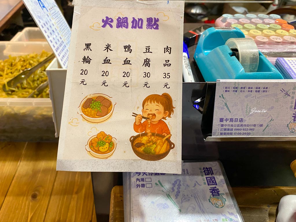 除了菜單上的品項,櫃台邊還有火鍋加點項目,也有集點卡。